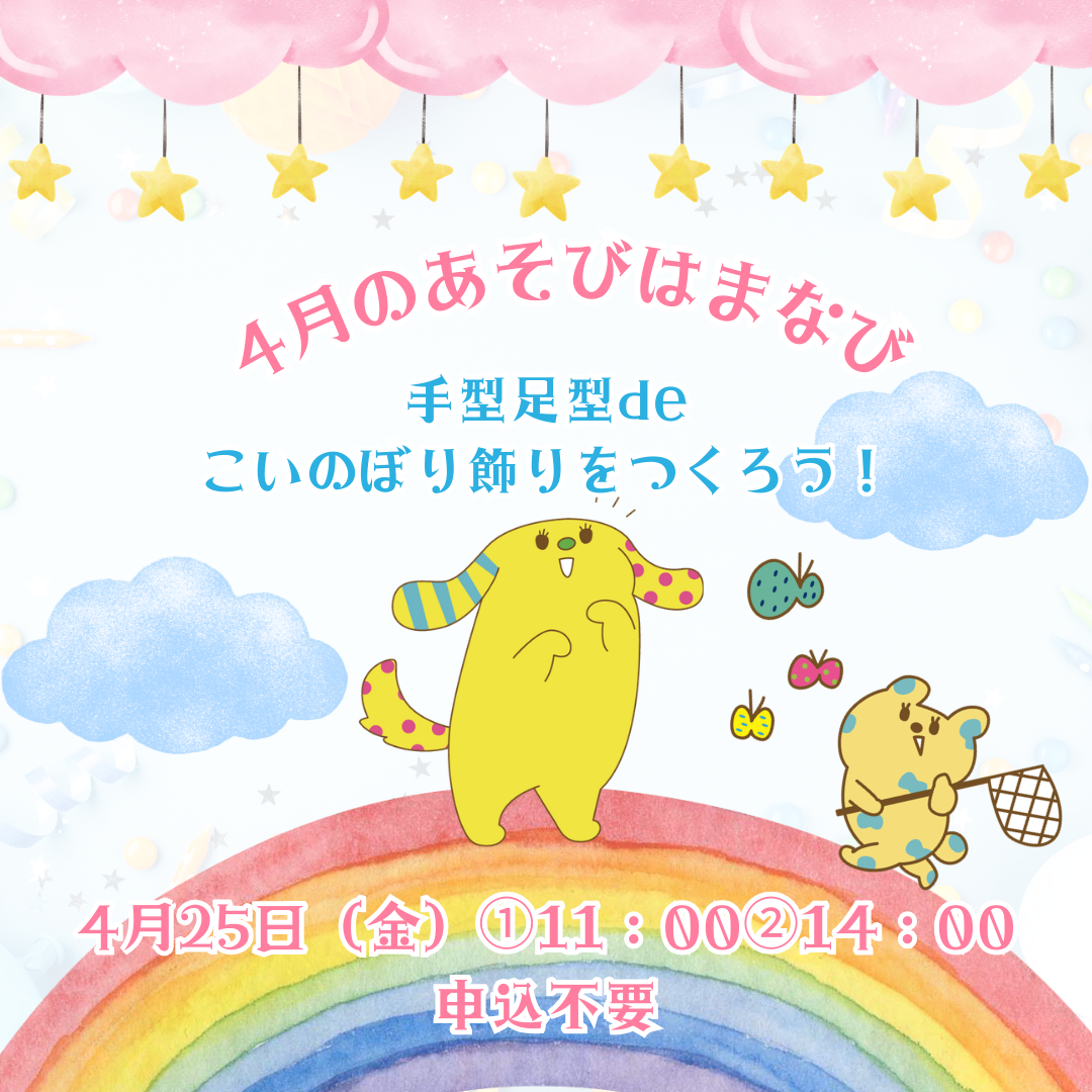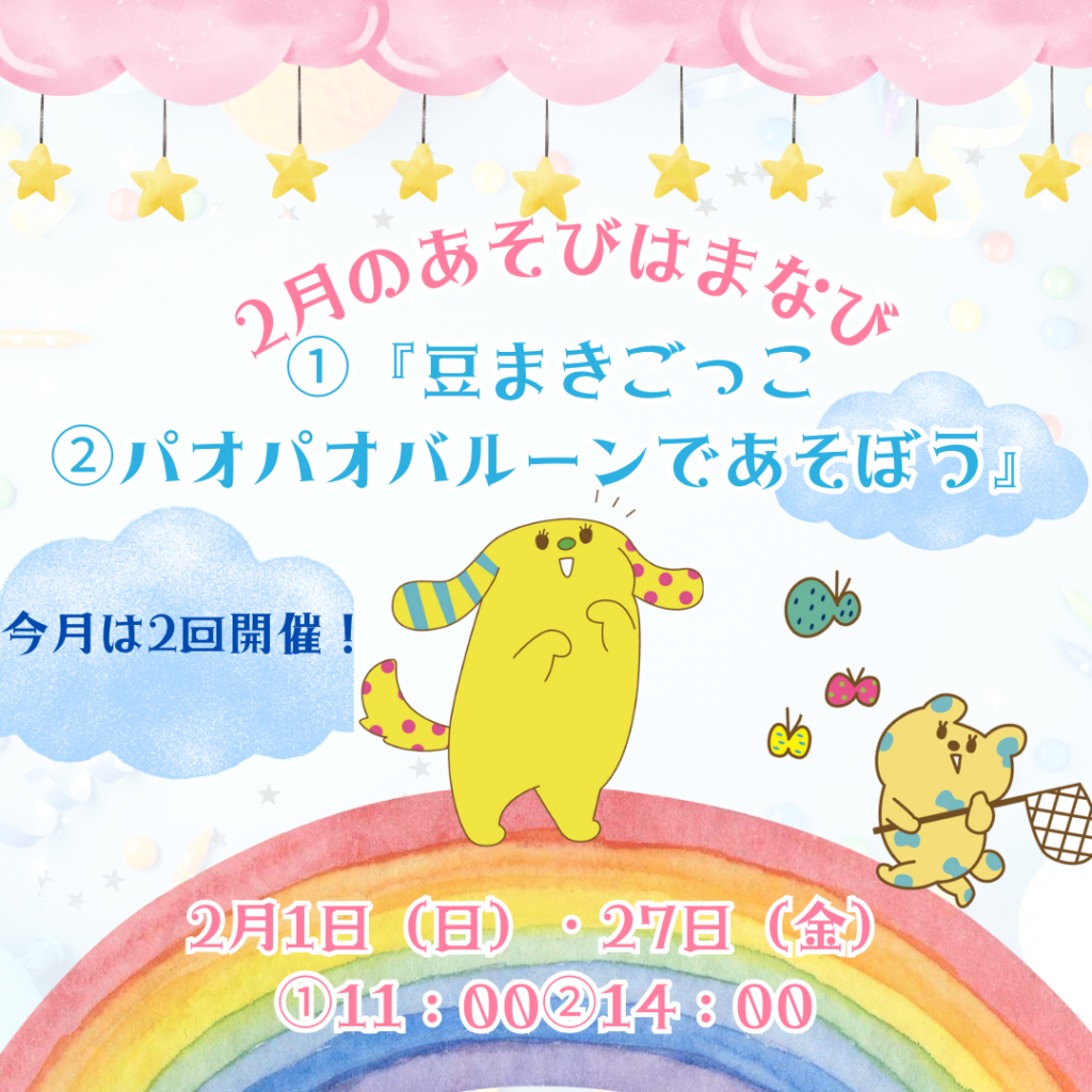 3/2(月)『お休みです』またあそびにきてね※「3月おたんじょう会申込締切日」3/5(木)11:00~『楽しいイースター~親子で楽しもう♬~hop hop Easter』inイオンホール3/6(金)10:30~11:15『ふたご・みつごサロン』親子ひろばときめっく☎...