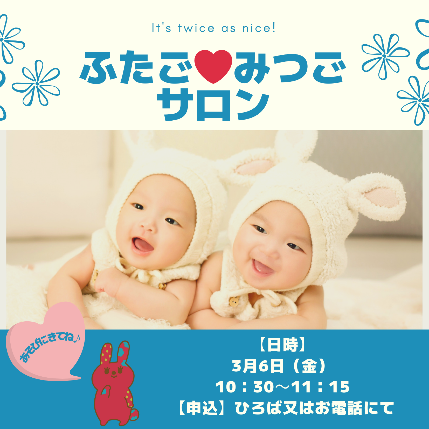 2/9(月)『お休みです』またあそびにきてね※2月おたんじょう会申込締切日2/11(水)祝『開館しています』あそびに来てね2/12(木)『お休みです』またあそびにきてね親子ひろばときめっく☎0572-56-7833(開館時間10:00~17:00)※親子ひろばときめ...
