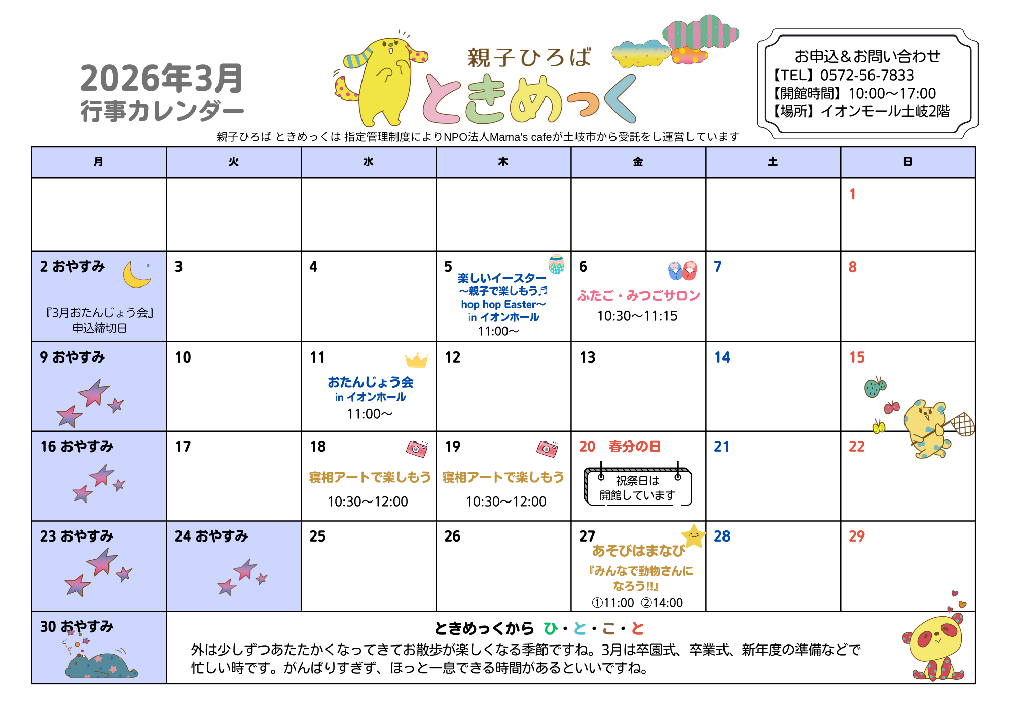 3月 ときめっくカレンダー 2026年2月10日 mamascafe 0 3月のひろばカレンダーです♪気になる講座はありますか?親子ひろばときめっく ☎0572-56-7833(開館時間10:00~17:00) 親子ひろばときめっく