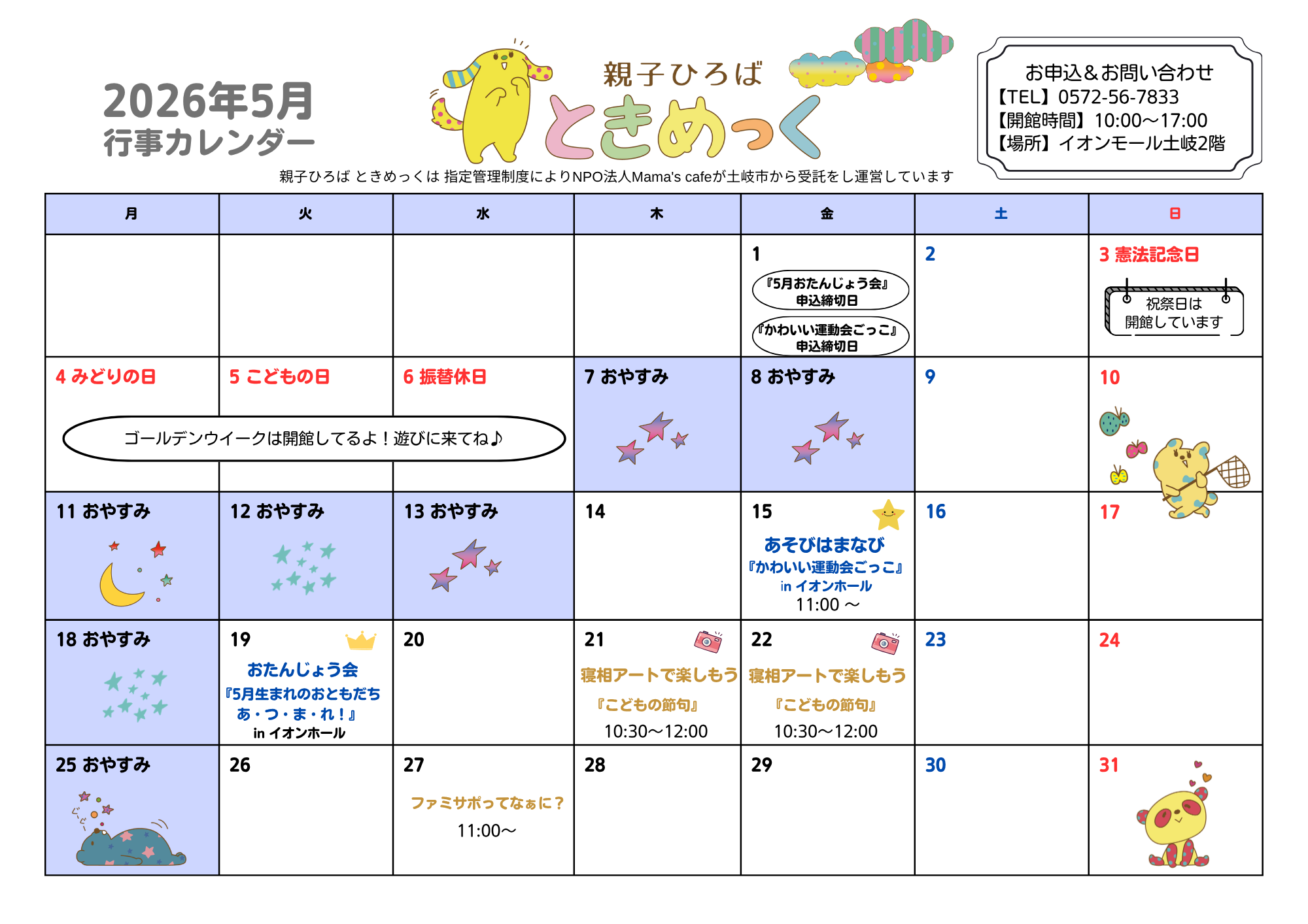 5月 ときめっくカレンダー 2026年4月8日 mamascafe 0 5月のひろばカレンダーです♪気になる講座はありますか?親子ひろばときめっく ☎0572-56-7833(開館時間10:00~17:00) 親子ひろばときめっく
