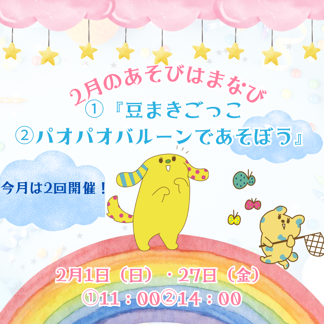 第1回『豆まきごっこ』みんなで鬼さんをたおしちゃおう!!お楽しみに♪【日時】2月1日(日) ①11:00 ②14:00 第2回『パオパオバルーンであそぼう!』大人気のパオパオバルーン♪お子さんと一緒にみんなで楽しみましょ...