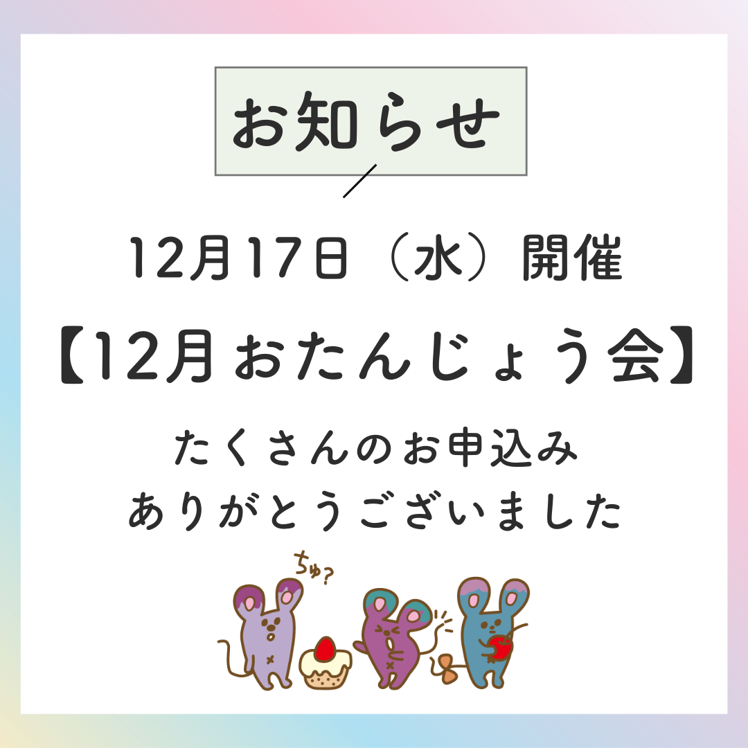 12/15(月)『お休みです』またあそびにきてね・うたあそび申込締切 12/17(水)11:00~『おたんじょう会』inイオンホール~12月生まれのおともだち集まれ!~ 12/18(木)11:00~11:30『はじめての...