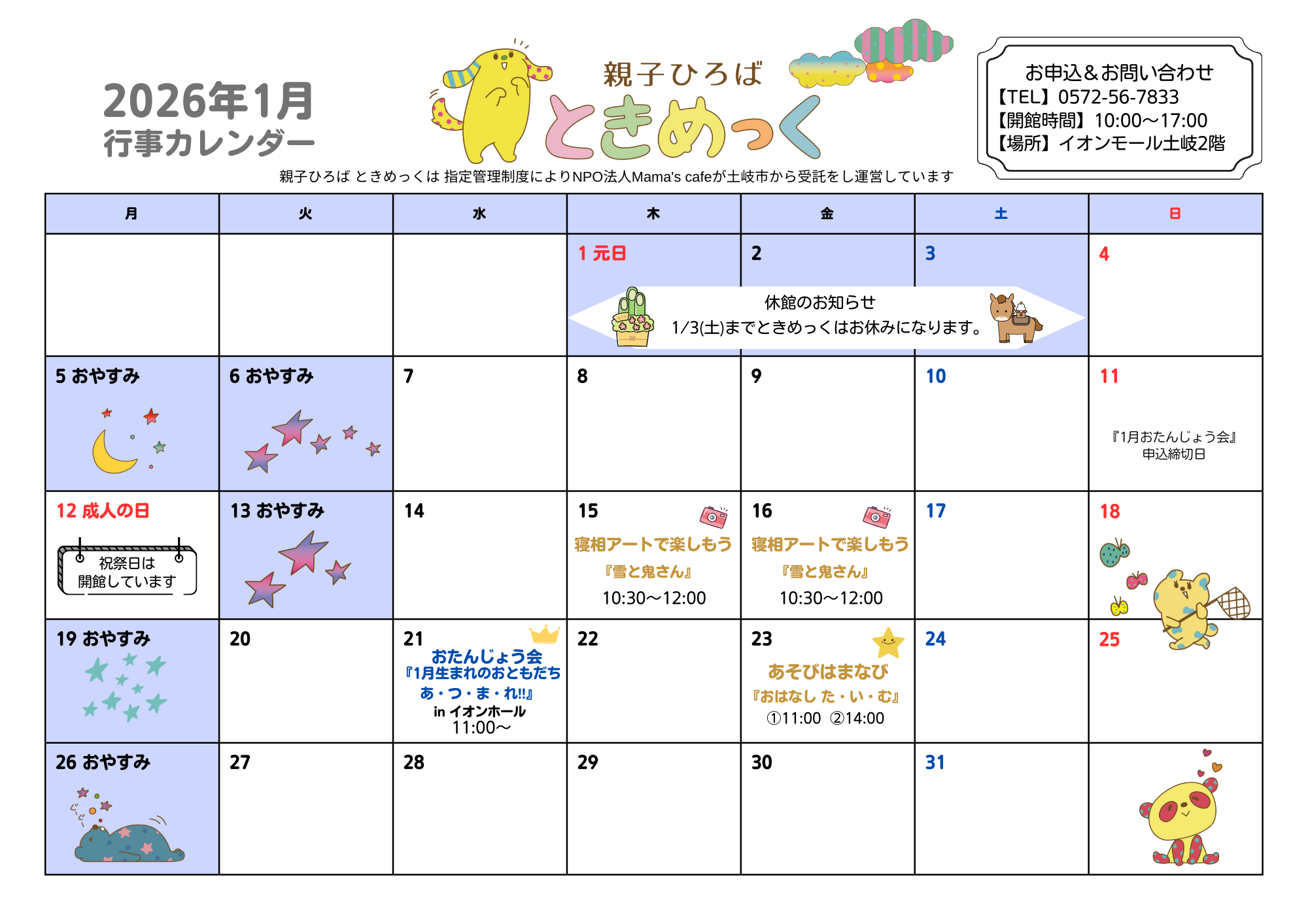 1月のひろばカレンダーです♪気になる講座はありますか? 親子ひろばときめっく ☎0572-56-7833(開館時間10:00~17:00)
