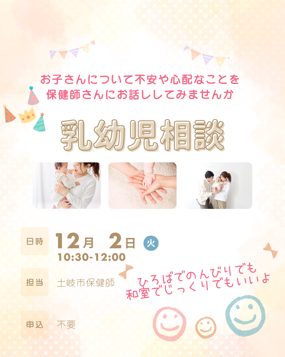 お子さんについて不安な事や心配事を保健師さんにお話してみませんか?ひろばでのんびり遊びながらでも、和室でじっくり・・・でも◎ 【日時】12月2日(火)10:30~12:00【担当】土岐市保健師【申込】不要 【ご予約・お問...